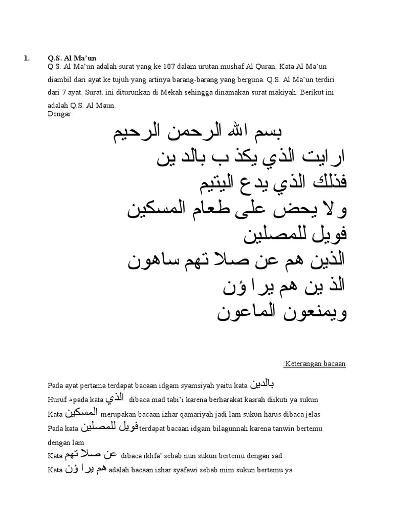 Al maun sendiri secara bahasa memiliki pengertian makna atau arti barang barang yang berguna. Asbabul nuzul sebab turunya surat ini ialah berkenaan. Baca surat al ma'un lengkap bacaan arab, latin & terjemah indonesia. Huruf mad ini ada lima, yaitu Surat ini berisikan informasi tentang orang orang yang mendustakan agama yakni mereka yang berbuat.
