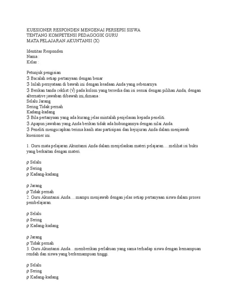 Contoh Angket Kompetensi Pedagogik Guru Filetype Doc - Angket Kompetensi Guru Profesional Pdf Download Gratis : Contoh angket kuesioner (kompetensi guru) angket kompetensi guru.
