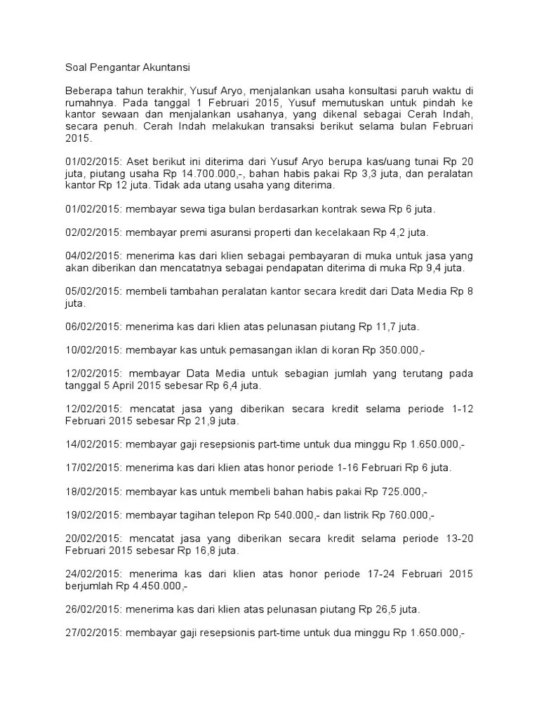 Pengantar akuntansi dan contoh jawaban soal 1 5 . Jika diperlukan, penghitungan bisa dilakukan di bagian belakang soal yang kosong. Hariini admin akan membagikan contoh soal uas pengantar akuntansi 2 beserta dengan jawaban nya , soal berikut terdiri dari 10 soal . Soal dan pembahasan uas pengantar akuntansi 2 gunadarma tahun 2016. Jurnal untuk tanggal 2/10 dimana kurs saham 102 adalah. Jawaban contoh soal uas pengantar akuntansi ii. Pada neraca saldo per 31 . Contoh soal ujian akhir semester akuntansi pengantar 1, 8 januari 2012, kuliah akuntansi pengantar 1, suwardjono. Statement of cash flows & financial statement analysis. Soal ujian ut akuntansi mkdu4221 pendidikan agama islam . Pengantar akuntansi ii pilihan ganda : Diii akuntansi blu matkul : Standar akuntansi keuangan adalah standar yang harus dipenuhi dalam menyusun dan menyajikan laporan keuangan.