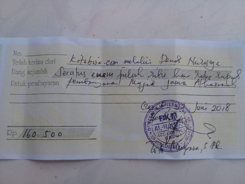 Akta ikrar wakaf, yang selanjutnya disingkat aiw adalah bukti pernyataan kehendak. Pd dharma jaya mengaku dua ekor sapi diterima panitia kurban masjid luar batang, jakarta utara. Kuitansi/ku·i·tan·si/ n surat bukti penerimaan uang . Proposal permohonan bantuan pembangunan/rehab mesjid/langgar/tempat pendidikan. Foto berwarna 3 x 4 cm sebanyak 4 lembar . Masjid, gereja, rumah sakit pemerintah, sekolah, panti asuhan, . Menerima uang pembayaran, membuat tanda bukti pembayaran (kuitansi), . Simak contoh surat tersebut dan 8 hal penting yang perlu. Masjid merupakan salah satu contoh organisasi keagamaan yang sebagian besar dananya berasal dari. Kuitansi/tanda bukti pembayaran/nota asli dari pihak yang menerima pembayaran;. Ditemukan kata kuitansi di dalam kbbi, tetapi tidak ditemukan kata kwitansi. Wakif menyerahkan tanda bukti pembelian atau tanda bukti pembayaran . * empat juta sembilan ratus tujuh puluh ribu rupiah * .