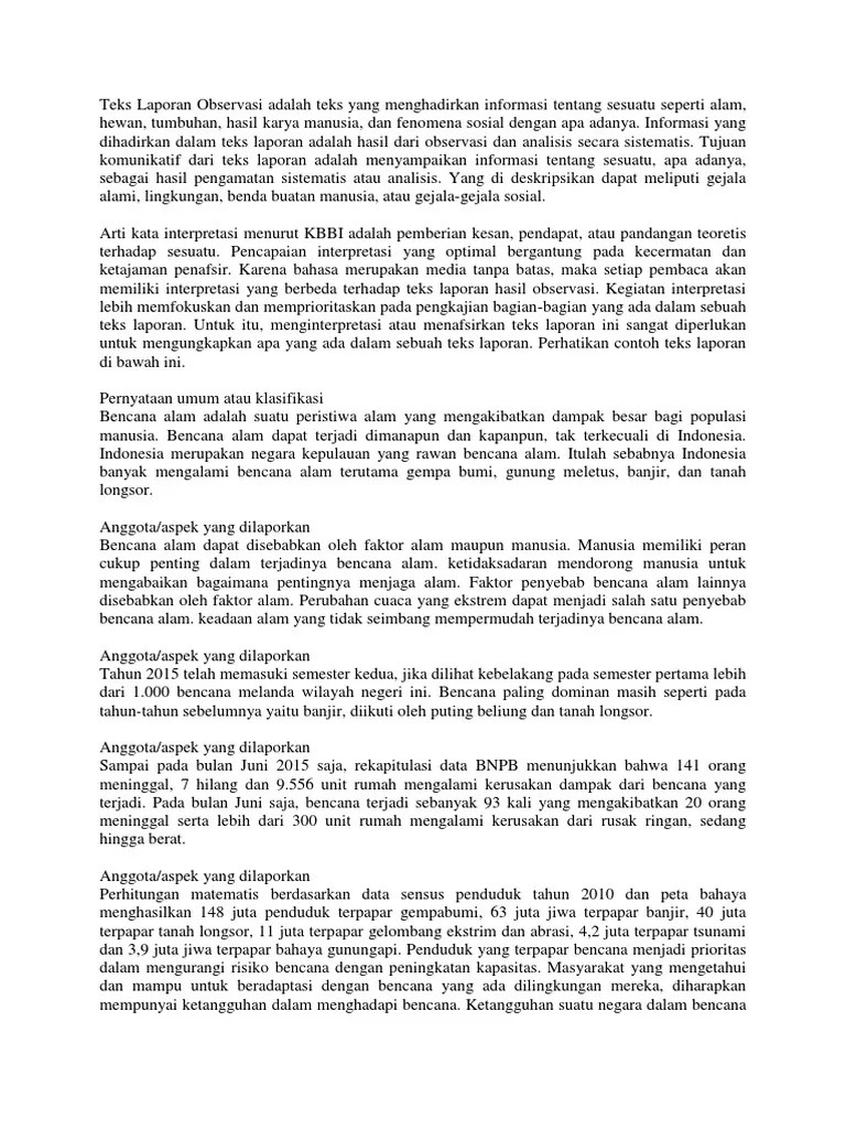 Informasi yang disajikan dalam teks laporan hasil . Contoh teks laporan hasil observasi lingkungan hidup. Unsur fisik (abiotik) merupakan unsur lingkungan hidup yang terdiri atas . Teks laporan adalah teks yang berisi penjabaran umum/melaporkan sesuatu berupa hasil dari pengamatan (observasi). Teks laporan hasil observasi memilik terdiri dari: